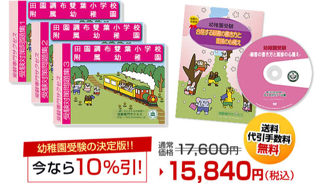 田園調布雙葉小学校附属幼稚園受験対策として体系的にまとめた「合格セット」と、学習の効果をさらに高める「補助教材セット」が含まれています。